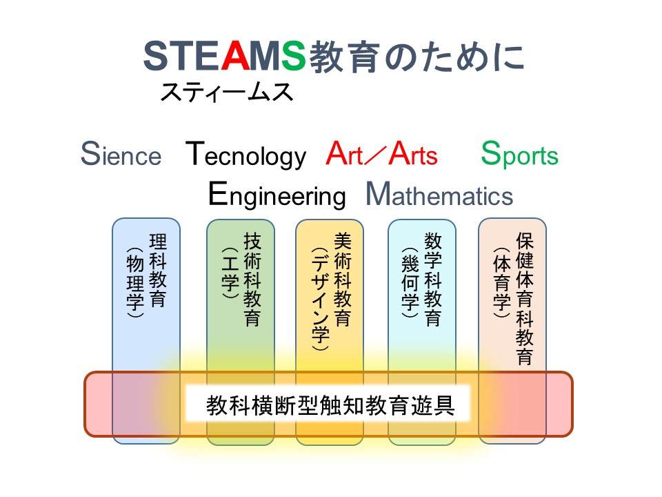 その趣旨からいえば、これまで制作してきた「教科横断型触知教育遊具」は、知る(探究)・作る(創造)・動かす (実現)サイクルを生み出す分野横断的な新しい学びの「STEAMS教育」支援の教材として極めて相応しいものである。